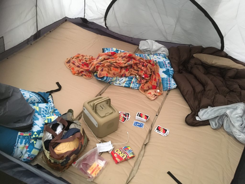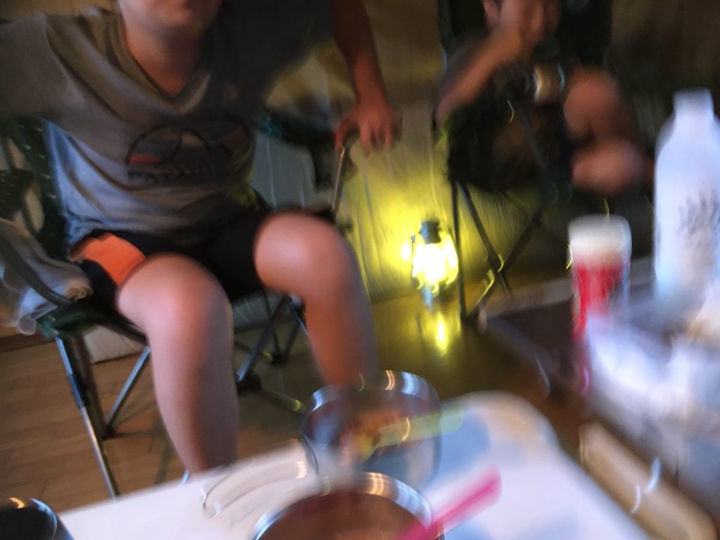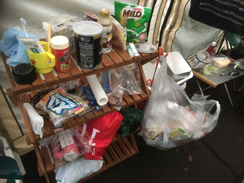 とはいえ、頑張って張ったテントの中は思っていたより快適に過ごせましたが、なかなかの散らかり具合で、アグレッシブな感じ。どーも落ち着きませんでした。よくインスタやフェイスブックでオシャンな人たちがスタイリッシュに仕上げている空間とは大違い( ̄▽ ̄)