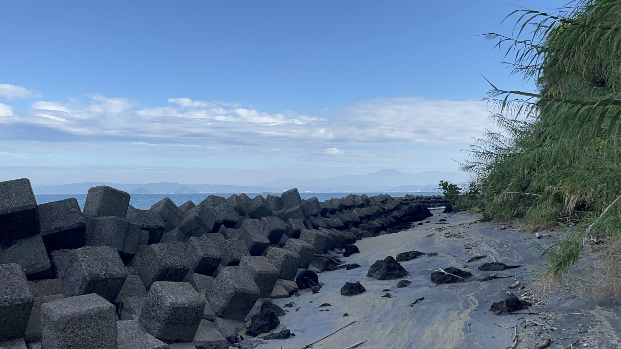 さて先ほどの公民館から左手の方角へ進んでいくとテトラポットがズラ〜っと並ぶ砂浜が続きます。