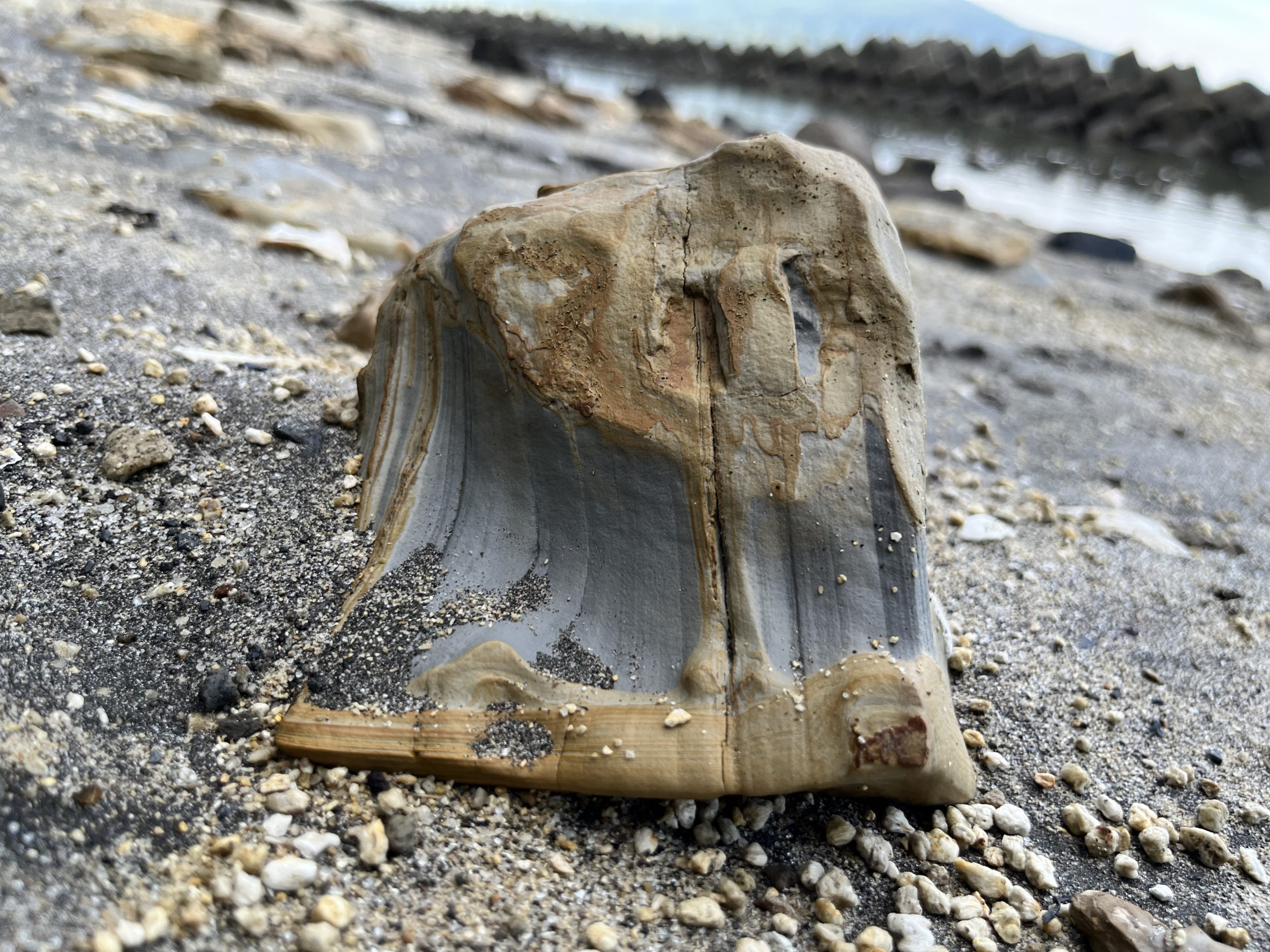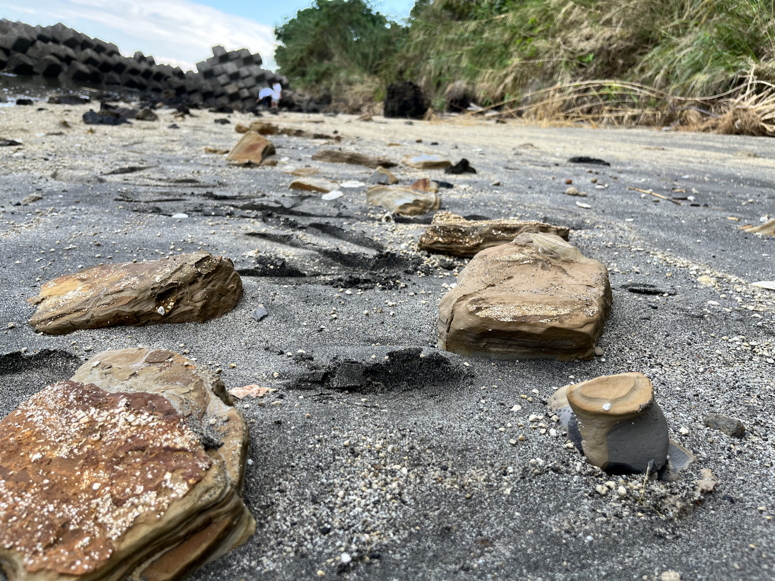 少し進んでいくと何やら変わった色の石がちらほら。よく見ると中の方はまた色が違うセメントのような色。